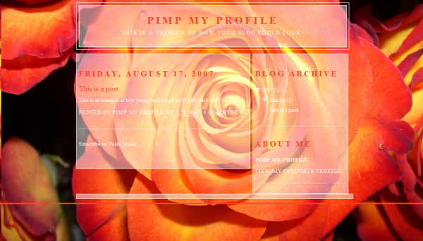 I wish I had thought to take a before shot of her blog. I did think of it...yesterday. I just didn't think about it today until I had already installed the design. Duh. I'll remember next time. Regardless, I can give you an approximation of what her blog looked like. I think she was using this design from Pimp My Profiles: